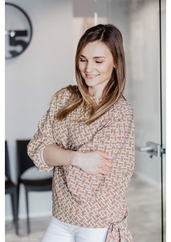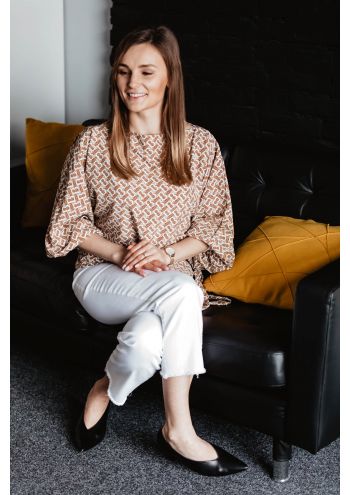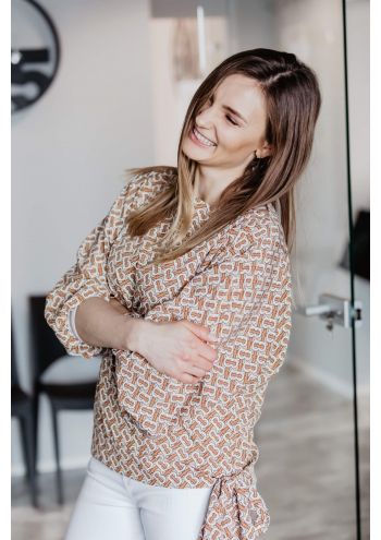 Bardzo efektowna bluzka z oliwkowym regularnym wzorem, bardzo szerokimi rękawami i płaskim dekoltem. Fantazyjne boczne wiązanie dodaje charakteru, odmładza i sprawia, że bluzka poza sprawdzi się nie tylko w zestawieniach stricte casualowych, ale również w stylizacjach szykowanych na imprezę czy atrakcyjny wieczór zakończony tańcami.