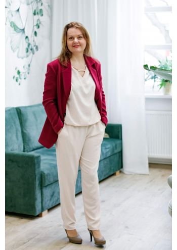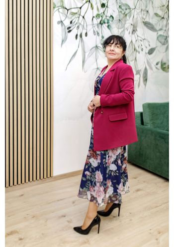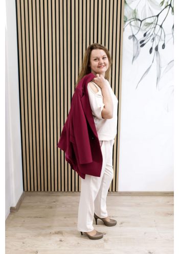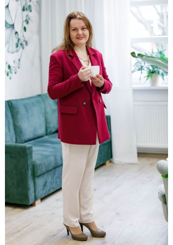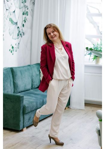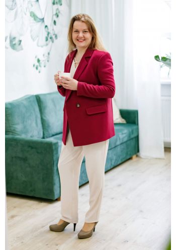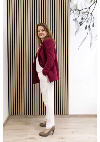Marynarka z mięsistej mieszanki wiskozy z dodatkiem nylonu. Tkanina o charakterze krepy, bardzo szlachetna, zbita i gładka. Mocne nasycenie koloru. Fason oversize z opuszczona linią ramienia, delikatną poduszką i otwartymi klapami. Dwurzędowa, zapinana na guziki imitujące szylkret w matowym wykończeniu. Odszyty acetatową podszewką. Ten model jest nonszalancki, odważny ale jednocześnie uniwersalny. Stworzy garnitur ze spodniami Patrone.
