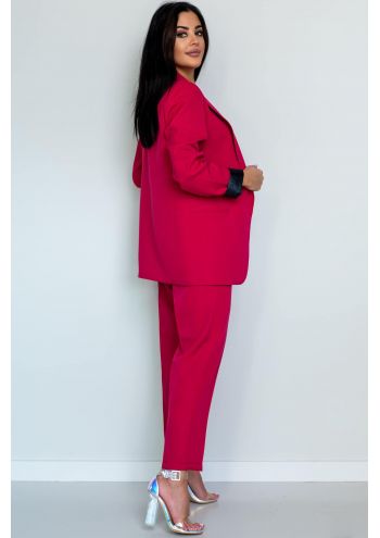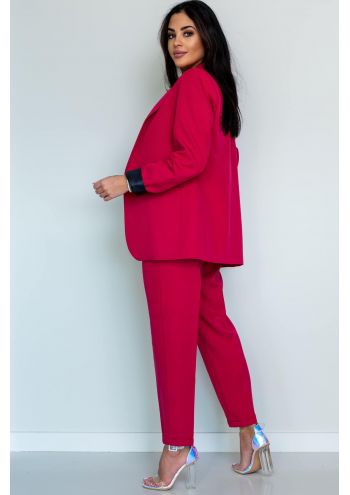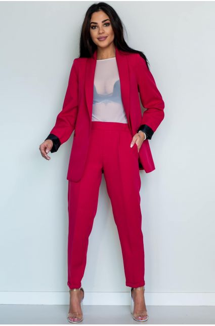 Nowoczesna, tkaninowa damska marynarka w kolorze fuchsii. Bardzo ciekawy fason pozbawiony zapięcia (marynarka zawsze pozostaje rozchylona), z eleganckimi szalowymi klapami (przypominającymi przeciągnięty kołnierz, znanymi ze smokingów i poważnych marynarek wieczorowych) i marszczonymi rękawami z podszewką, o długości 3/4. Marynarka stwarza aurę nowoczesności i profesjonalizmu, co sprawia, że idealnie wpasuje się w klimat służbowych, biznesowych i korporacyjnych dress code'ów.