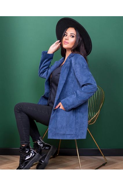 Jesień to czas , aby założyć marynarkę z drobnego sztruksu w kolorze niebieskim o prostym kroju bez wcięcia na podszewce z dużymi kieszeniami . Marynarka posiada dwa ozdobne guziki ma długi kołnierz , otwarte klapy z tyłu rozcięcie . Krój marynarki sprawia , że będzie idealna do pracy oraz na wyjście z przyjaciółmi i otuli nas w chłodniejsze dni .