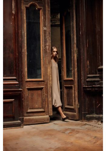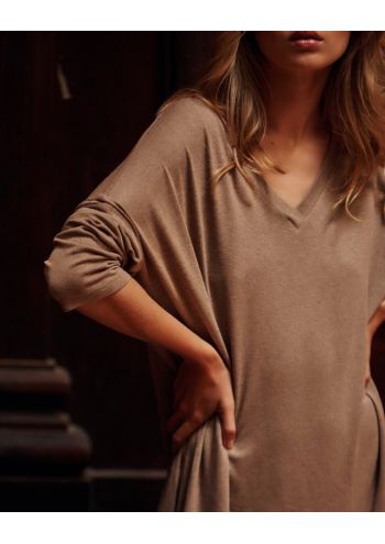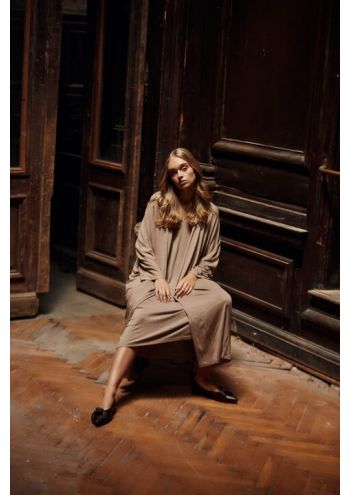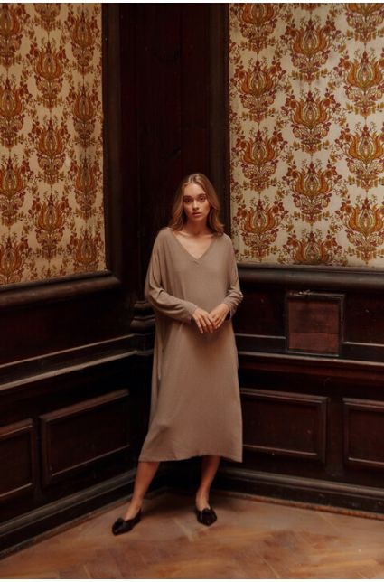 Swobodna sukienka midi w fasonie oversize z dekoltem w serek i długim rękawem. Wykończona ściągaczem, który zapewnia wygodę i komfort, dzięki przyjemnej w dotyku, miękko otulającej dzianinie w kolorze beżowym, sprawi, że poczujesz się w niej dobrze i ciepło. Bardzo uniwersalna.