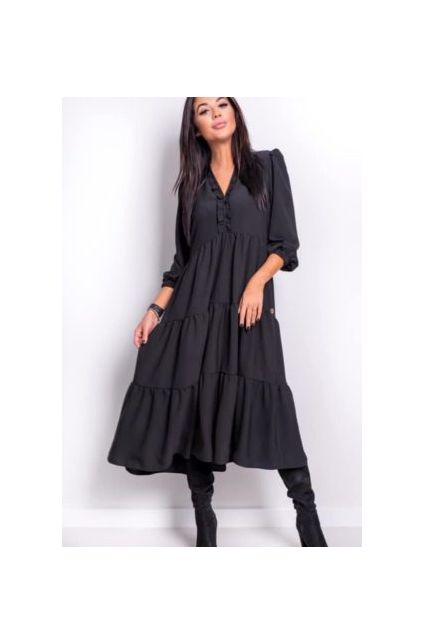 Sukienka z falban Pola to bardzo dziewczęcy fason długości midi, wyraźnie zaznaczonej talii i rozszerzających się ku dołowi rękawach 3/4, zakończonych wąskimi mankietami zapinanymi na guzik. Szczególnego uroku dodaje jej ozdobne marszczenie przy dekolcie. Bardzo uniwersalna, świetnie sprawdzi się przy każdej okazji i o każdej porze roku. Równie dobrze będzie wyglądać w zimowym zestawieniu z kozaczkami jak i letnim - z sandałami.
